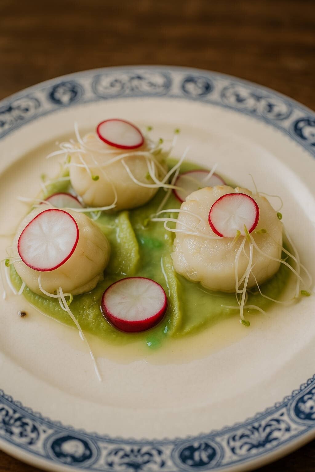 Saint-Jacques snackées, émulsion de petits pois et citron vert